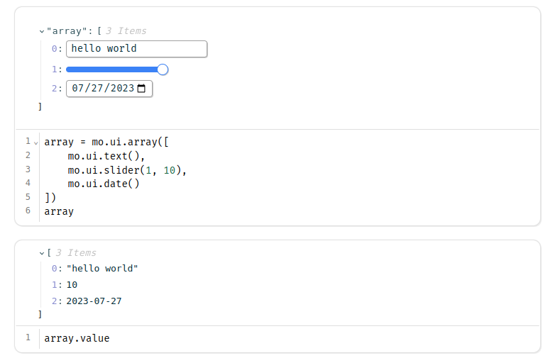 Display UI elements in the output area above a cell by including them in the last expression, just like any other object. You can also embed elements in markdown using Python f-strings, like so: